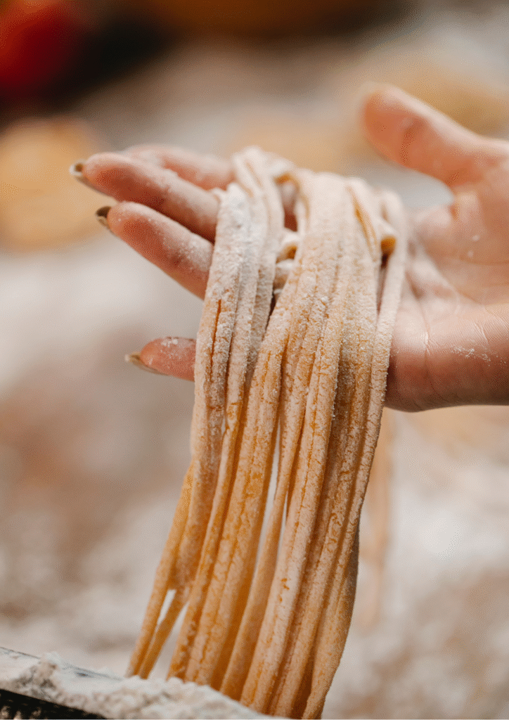 You’ll learn to make traditional fresh pasta from scratch like tagliatelle, ravioli, or fettuccine, depending on the class. We also teach how to prepare authentic Italian sauces to pair with them.